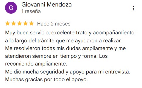 Muy buen servicio. Resolvieron todas mis dudas y me guiaron en cada paso. En pocos días ya tenía mi cita y hoy ya tengo mi visa en mano.